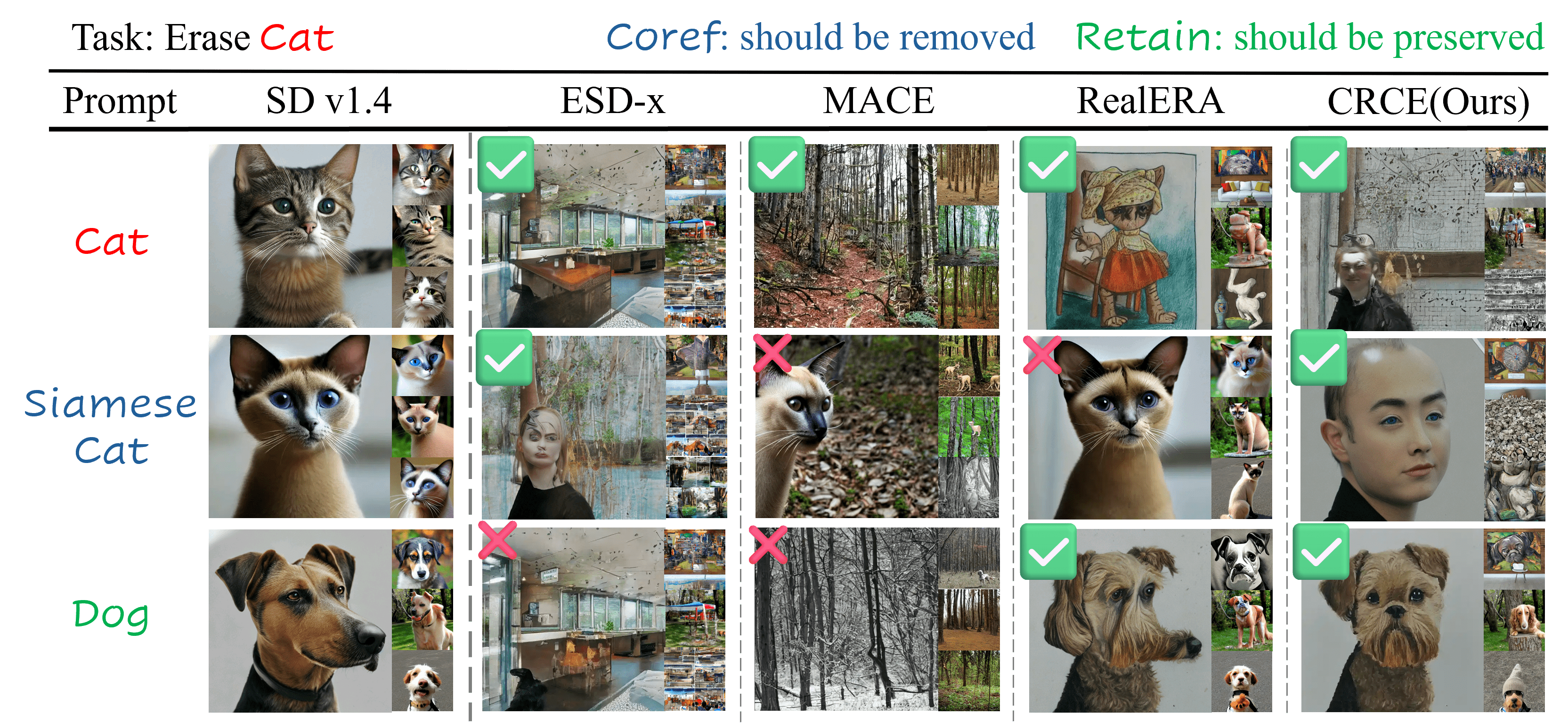 Abstract: Existing concept erasure methods struggle with under-erasure (leaving residual traces) or over-erasure (eliminating unrelated concepts). We propose CRCE, which leverages LLMs to identify semantically related coreferential concepts to erase alongside the target and distinct concepts to preserve, enabling precise concept removal without unintended collateral damage. CRCE outperforms existing methods on object, identity, and IP erasure tasks.